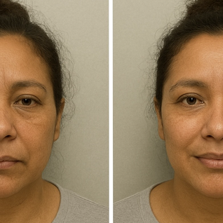 For older patients who may have naturally lost volume from the fat pads in their cheek area, cheek augmentation treatment aims to replace midfacial volume loss. In turn this treatment not only helps to fill the hollows of the cheeks, giving a more youthful look. It also helps to lift sagging of the cheeks and as a result improves lower facial jowling and lines/ winkles. Thus giving a "mini face lift" appearance without invasive surgery.